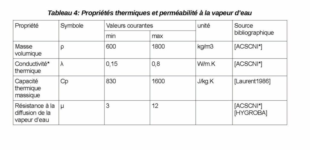 Il n’existe pas de données spécifiques et universelles pour le torchis traditionnel, la littérature donnant des plages larges et des valeurs pour des matériaux proches (BTC, CEB, pisé).